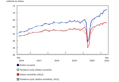 Depuis qu’elles ont atteint un creux de 49,0 milliards de dollars en avril 2020 pendant la pandémie de COVID-19, les ventes ont connu 11 augmentations en 13 mois et, en mai 2021, elles ont été supérieures de 11,0 % au niveau observé avant la pandémie, soit en février 2020. Au cours de la période de 10 mois d’août 2020 à mai 2021, les ventes dans le secteur ont atteint des sommets sans précédent et ont culminé en mai 2021.