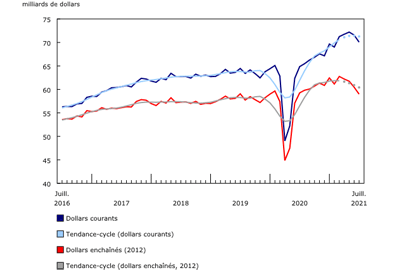 Les ventes de produits alimentaires, de boissons et de tabac ont reculé pour un deuxième mois d’affilée, en baisse de 0,8 % pour s’établir à 12,7 milliards de dollars. Les ventes dans le sous-secteur ont été relativement stables depuis le début de la pandémie; de mai 2020 à juillet 2021, elles ont atteint entre 12 et 13 milliards de dollars par mois.