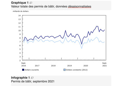 En dollars constants (2012 = 100), la valeur des permis de bâtir a diminué de 6,6 % pour s’établir à 20,4 milliards de dollars au troisième trimestre, et elle était en baisse de 3,1 % par rapport à la même période un an plus tôt. Le recul d’une année à l’autre en dollars constants est principalement le résultat des prix plus élevés de la construction en 2021.