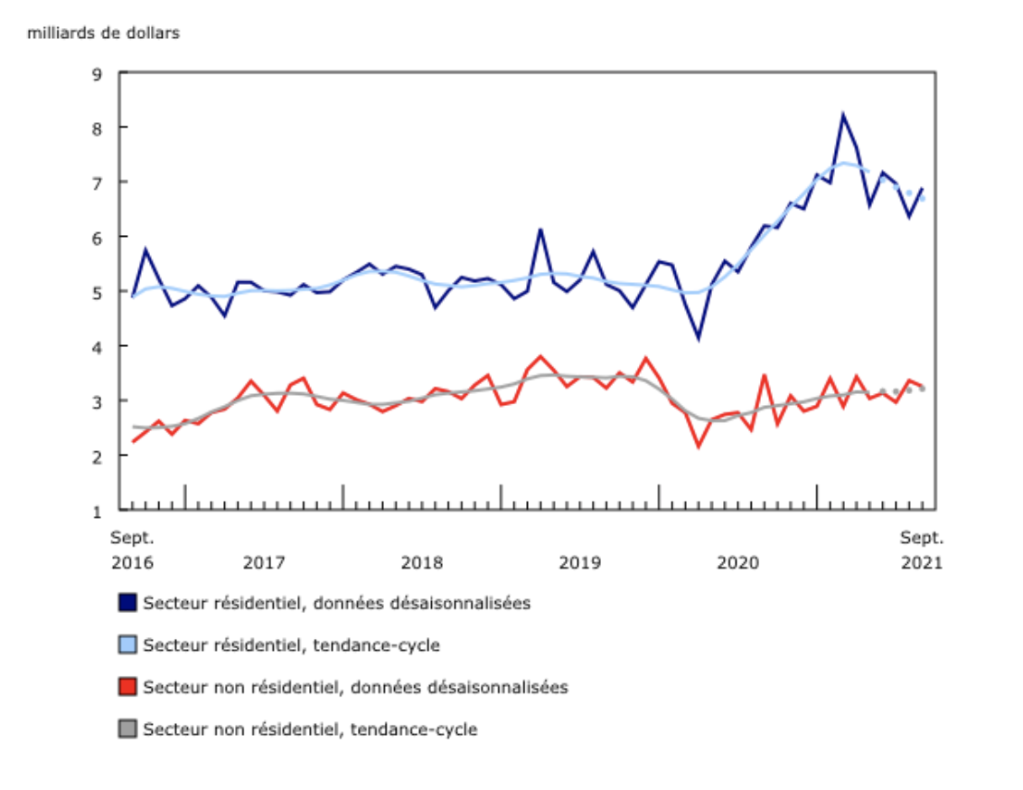 Dans l’ensemble, la valeur des permis de bâtir dans le secteur résidentiel a augmenté de 8,2 % en septembre pour atteindre 6,9 milliards de dollars.