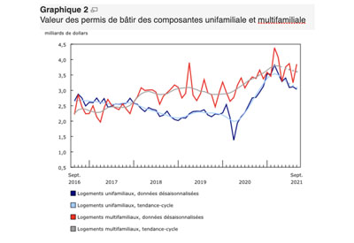 La valeur des permis de bâtir dans le secteur résidentiel a diminué de 5,4 % pour s’établir à 20,2 milliards de dollars au troisième trimestre de 2021, et des baisses ont été enregistrées à la fois pour les logements unifamiliaux et multifamiliaux. Par contre, d’une année à l’autre, la valeur des permis de bâtir dans le secteur résidentiel a affiché une hausse de 16,5 %.