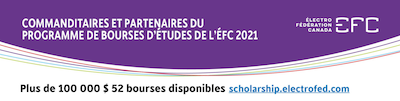 L’Électro-Fédération Canada (ÉFC), grâce au soutien de ses membres, est fière d’aider les étudiants universitaires et collégiaux à atteindre leurs objectifs scolaires en donnant des bourses d’études et des possibilités de carrière.