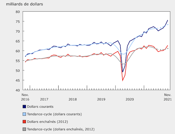 Les ventes de matériaux et de fournitures de construction se sont accrues de 7,1 % en novembre pour atteindre 12,3 milliards de dollars, sous l’effet des ventes plus élevées dans l’industrie du bois d’œuvre, des menuiseries préfabriquées, des articles de quincaillerie et des autres fournitures de construction, ainsi que dans l’industrie des métaux et produits métalliques. Il s’agit de la troisième hausse au cours des quatre derniers mois, les ventes de novembre 2021 ayant augmenté de 20,7 % par rapport à celles de novembre 2020. La croissance des ventes tout au long de 2021 dans le sous-secteur des matériaux et fournitures de construction a été appuyée par la demande soutenue liée à la construction de maisons neuves et à la rénovation. Les mises en chantier cumulatives de janvier à novembre 2021 étaient supérieures de 28,5 % à celles de la même période en 2020. De janvier à novembre 2021, les dépenses en rénovation domiciliaire ont augmenté de 29,8 % par rapport à la même période en 2020.