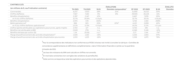 Au premier trimestre de 2022, ABB s’attend à ce que l’activité des marchés sous-jacents reste généralement stable par rapport au trimestre précédent. Le chiffre d’affaires du premier trimestre a tendance, séquentiellement, à être saisonnièrement plus faible en chiffres absolus. ABB s’attend à ce que la marge du BAIIA opérationnel reste essentiellement stable ou augmente légèrement par rapport au trimestre précédent.