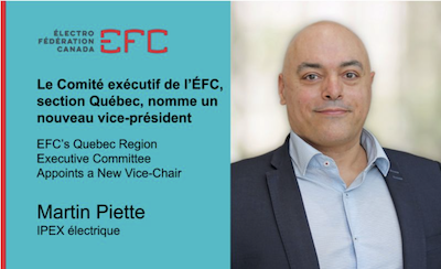 Les membres du comité exécutif de l’ÉFC, section Québec ont le plaisir de vous annoncer la nomination d’un nouveau Vice-président de l’ÉFC, section Québec; Martin Piette de IPEX électrique.