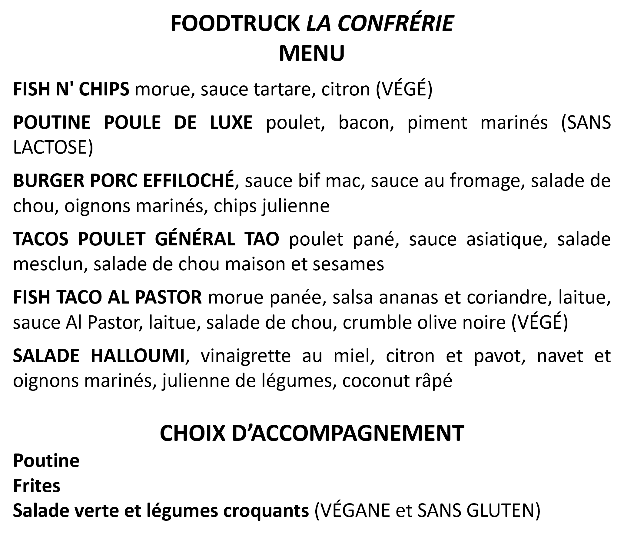 Membres du Réseau des jeunes professionnel de l’ÉFC Québec! Joignez-vous à nous pour un délicieux diner du foodtruck La Confrérie le 15 juin prochain. Veuillez consulter le menu.