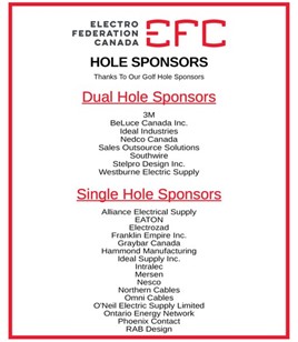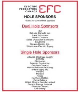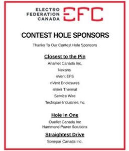 Les membres ont eu l’occasion de réseauter, d’échanger et de rehausser le profil de leur entreprise dans un cadre amusant et décontracté regroupant des leaders et des jeunes professionnels répartis sur cinq parcours de neuf trous. Les participants ont pu profiter d’une journée ensoleillée riche en événements et en concours spécifiques à certains trous, dont trois trous en un pour courir la chance de gagner un vélo électrique de Vintage Iron. Les commanditaires, eux, ont fourni diverses activités, notamment des échantillons de boissons du 19e trou, une station de bien-être de crème glacée CEMRA, une station de smoothies, une station de poutine, des musiciens sur place, un joueur de cornemuse, et plus encore. Pour compléter l’événement, les golfeurs ont pu profiter d’un dîner de réception et enchérir sur des articles de vente aux enchères silencieuses offerts par des membres de la communauté de l’électricité. L’ÉFC est également fière d’annoncer que plus de 5 000 $ ont été récoltés lors de la vente aux enchères silencieuses, au profit du Programme de bourses d’études de l’ÉFC. Les anciens membres de l’industrie ont été accueillis dans un quatuor commandité par Eaton, et le Réseau des jeunes professionnels (RJP) a participé en offrant un cadeau de départ spécial.