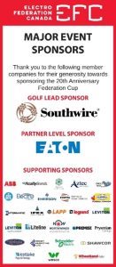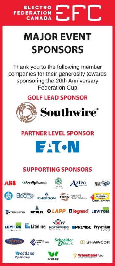 Nous remercions notre commanditaire principal, Southwire, notre commanditaire partenaire, Eaton, ainsi que tous les commanditaires des concours et les donateurs aux enchères silencieuses. Les généreuses contributions et le soutien continu de nos membres sont grandement appréciés.