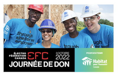 Le 3 octobre, Journée mondiale de l’habitat, les membres de l’Électro-Fédération Canada (ÉFC) et leurs partenaires commerciaux s’unissent pour la deuxième Journée de don annuelle de l’ÉFC en soutien à Habitat pour l’humanité Canada. Ensemble, nous espérons amasser 250 000 $ pour aider des familles à acquérir de la force, de la stabilité et de l’indépendance au moyen de l’accès à une propriété abordable.