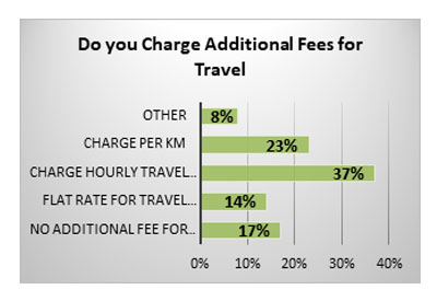 Autre fait intéressant, le troisième taux de réponse le plus élevé, soit 17 % des répondants, représentait les entreprises qui n’imposaient pas de frais supplémentaires pour les déplacements. Mais revenons à la géographie. Si l’on considère les villes éloignées ou les entreprises qui ont une zone de service relativement petite, le besoin de facturer des frais supplémentaires peut être inexistant ou, s’il faut le faire, cela peut être dû aux concurrents locaux qui n’imposent pas de frais supplémentaires et qui forcent les entreprises à proximité d’offrir les mêmes avantages pour leurs clients.
