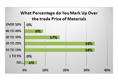L’examen des frais en sus d’un tarif horaire a généré une réponse extrêmement pointue qui nous permet d’identifier clairement une norme répandue dans toute l’industrie. 82 % des répondants ont indiqué qu’ils ne facturaient pas des frais de service en sus des tarifs horaires. Nous avions anticipé que la majorité des réponses à cette question indiquerait aucun frais de service additionnel, mais pas à ce point. Cela indique donc que la tendance nationale claire est de ne pas prélever un coût standard supplémentaire au tarif horaire. La tendance nationale montre qu’un niveau de standardisation est présent dans les bases de l’établissement des coûts des travaux sur un chantier, du moins à certains égards, et est probablement le résultat d’une philosophie axée sur le service des entrepreneurs en électricité visant à offrir un prix compétitif.