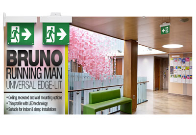 Beghelli introduit la première enseigne de type Edge-Lit à pictogramme « Homme qui court » véritablement universelle. Le modèle de la série Bruno est livré avec pictogrammes universels, fixation de montage universelle et tension universelle de 120-347 V. Six options de montage sont intégrées dans chaque boîte. Le boîtier en aluminium moulé sous pression de l’enseigne Bruno est le design Edge-Lit le plus compact de Beghelli. Offert dans une variété de finis peints ou brossés, le style contemporain du modèle Bruno peut aisément s’harmoniser à tout décor. Facilité de spécification, facilité pour les commandes et facilité d’installation – Bruno, c’est tout simple.