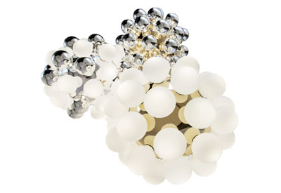 Le corps en polycarbonate du luminaire est entouré de 43 globes de verre à DEL de 1W. Lorsqu’elle est allumée, cette suspension lumineuse écoénergétique dégage une sensation organique, comme si vous marchiez dans une forêt.