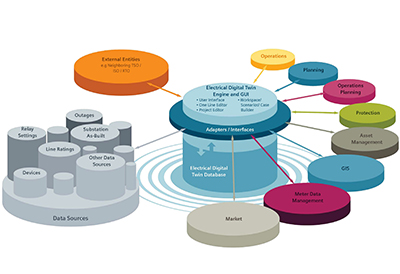 Siemens Electrical Digital Twin aligne étroitement les mondes réel et virtuel en fournissant aux services publics une source unique pour modéliser les données dans leur paysage informatique. Les données sont synchronisées à partir de divers systèmes, puis normalisées dans une base de données multiutilisateur via des adaptateurs/interfaces. Le modèle de réseau commun facilite la simulation de réseau dans tous les domaines pertinents pour la planification, l’exploitation et la maintenance de systèmes électriques fiables, efficaces et sécurisés.
