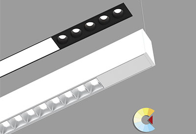 Vous pouvez combiner n’importe quelle optique linéaire Clusters pour former des luminaires continus sur mesure avec des conducteurs intégrés. Les combinaisons sont disponibles pour montage suspendu et encastré (avec diverses finitions de garniture).