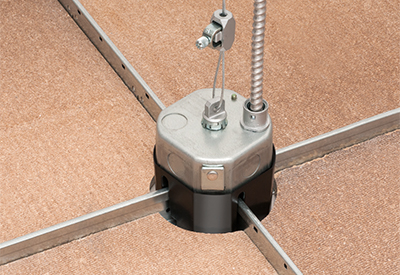 Arlington économique, UL Listed STEEL T-Box (FBS428SC) est le moyen rentable de monter des ventilateurs, des appareils, des détecteurs de fumée et de monoxyde de carbone, des caméras de sécurité, des panneaux de sortie et de l’éclairage d’urgence – jusqu’à 70 lbs – sur une grille de plafond suspendue.