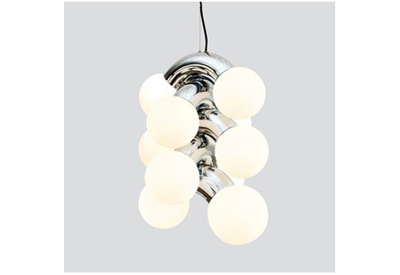 La série Vine présente une forme exagérée avec une propension à la répétition qui se traduit par un impact audacieux. Composée d’un arc chromé posé, flanqué de deux globes en verre rougeoyant – dans le cas du pendentif, la multiplication possible du module permet au luminaire de grandir, exagérant de façon exponentielle la silhouette globale du luminaire.