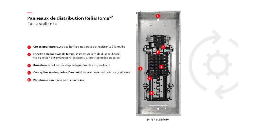 - Les panneaux de distribution ReliaHome offrent une conception de neutre enfichable et une plateforme de disjoncteurs courante pour simplifier le stockage distributeurs électriques et pour diminuer le temps d’installation pour les entrepreneurs électriques tout en ayant une grande disponibilité partout en Amérique