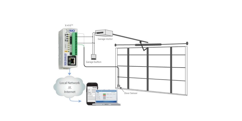 Dans une configuration typique, le X-410 est câblé en parallèle avec le bouton de votre porte de garage existant. Un capteur de contact surveille si la porte est ouverte ou fermée. Contrôlez la porte via le bouton ou à distance via un navigateur Web. De plus, avec les quatre relais du X-410, les entrées numériques et la compatibilité jusqu’à 16 capteurs, vous pouvez personnaliser votre système de contrôle pour l’adapter parfaitement à vos besoins.
