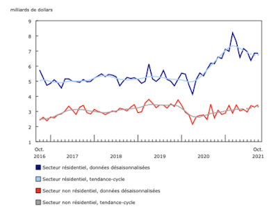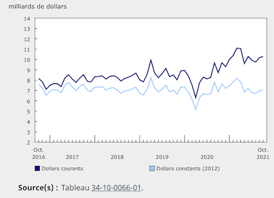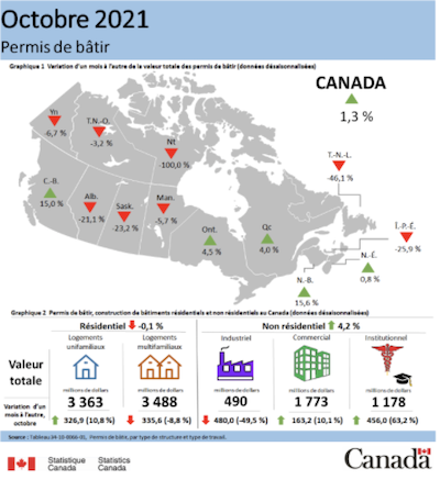 La valeur totale des permis de bâtir a augmenté de 1,3 % pour atteindre 10,3 milliards de dollars en octobre. La hausse est principalement attribuable à la Colombie-Britannique (+15,0 %) et à l’Ontario (+4,5 %). Les intentions de construction ont progressé de 4,2 % dans le secteur non résidentiel, tandis qu’elles ont légèrement diminué de 0,1 % dans le secteur résidentiel.