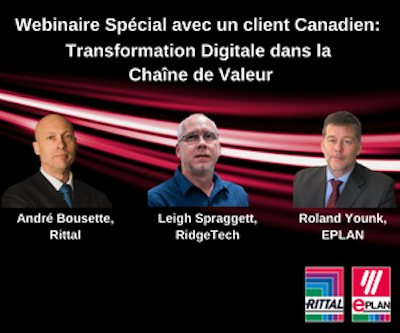 Le 2e jour du salon virtuel, Leigh Spraggett, président de RidgeTech Automation se joindra à Roland Younk, président d’EPLAN Canada et André Bousette, président de Rittal Systems Ltd. sur scène pour une présentation unique sur la façon dont la transformation numérique à travers la chaîne de valeur unique entre Rittal et EPLAN a contribué à améliorer leur productivité et a permis à RidgeTech de servir ses clients avec rien de moins que les solutions d’automatisation industrielle les plus fiables et de la plus haute qualité de l’industrie.