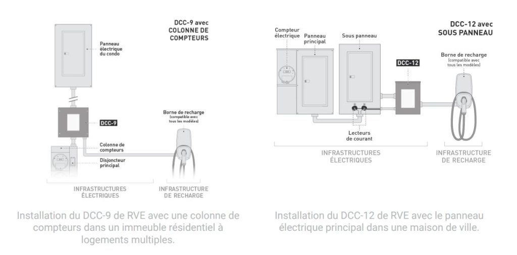 En multilogements, la solution DCC permet d’alimenter un ARVÉ (Appareillage de Recharge pour Véhicules Électriques) en interceptant l’artère en amont du panneau de distribution d’un logement, selon les assouplissements autorisés par la règle 8-106(10) ou 8-106(11) du Code canadien de l’électricité, Partie I (Code CE), infrastructure électrique privée. Le DCC, qui est un système de gestion de l’énergie des véhicules électriques, permet notamment de surveiller le courant de l’artère alimentant le panneau d’un logement et de délester la borne de recharge raccordée lorsque l’intensité du courant atteint un seuil préétabli