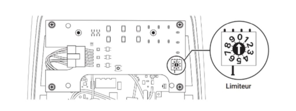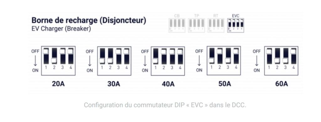 Il est également possible d’ajuster la puissance maximale de la borne de recharge en modifiant la position du commutateur DIP « EVC » dans le contrôleur de charge DCC selon le tableau suivant :