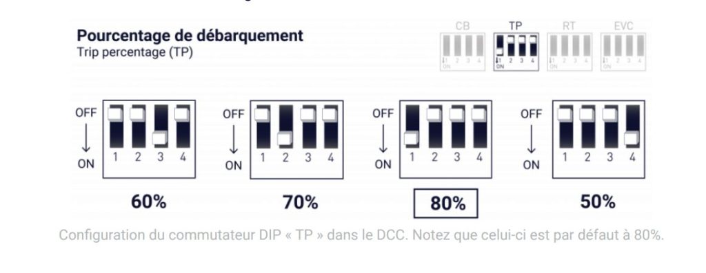 Afin de délester la borne plus tôt lors d’une pointe d’utilisation de l’énergie, il est possible de changer le seuil en pourcentage de la capacité maximale de l’artère du logement qui déclenche un délestage de la borne de recharge. Pour ceci, il faut modifier la position du commutateur DIP « TP » dans le contrôleur de charge DCC selon le tableau suivant :