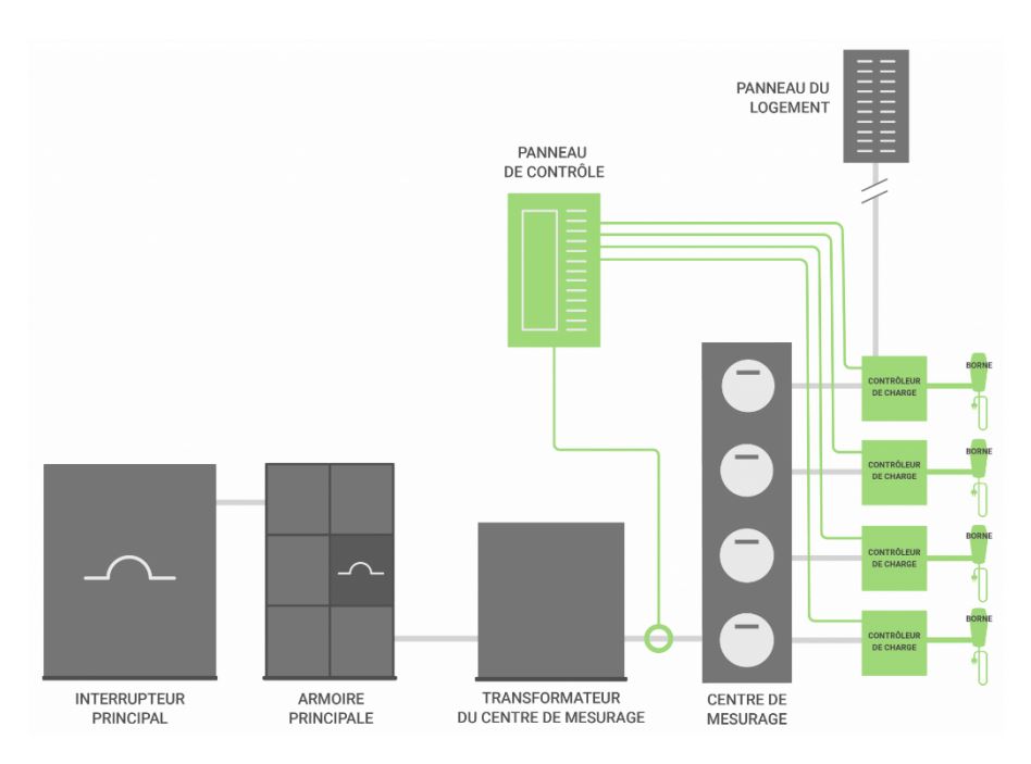 Afin de protéger la distribution en amont de l’artère du panneau des logements, il est également possible de faire l’installation d’un système de gestion de l’énergie du bâtiment (SGEVÉ multi-niveaux). Ce type de système permet d’optimiser la répartition de la puissance disponible à l’ensemble des bornes de recharge en surveillant les dérivations, les artères, ainsi que le branchement, pour éviter tout dépassement de la capacité de l’installation, à tous les niveaux.