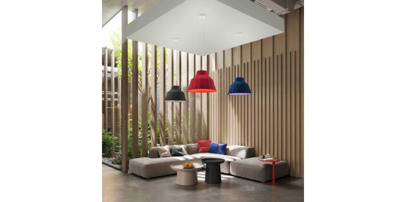 Frank comporte un abat-jour thermoformé fabriqué en feutre PET recyclé qui absorbe les sons et accroît le confort acoustique d’un espace. L’abat-jour de Frank, qui mesure 24,5 po de diamètre et 16,7 po de hauteur, est offert dans une palette de 22 couleurs.